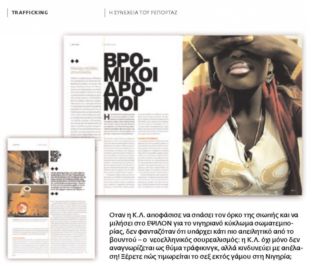Όταν ετοιμάζαμε την έρευνα στην εφημερίδα, ήμασταν πάρα πολύ προσεκτικοί στην επιλογή των στοιχείων που θα δημοσιεύαμε. Κι αυτό για να προστατεύσουμε τη νιγηριανή κοινότητα που στην συντριπτική της πλειοψηφία δεν έχει καμία σχέση με το έγκλημα της σωματεμπορίας. Θεωρούσαμε δε –αφελέστατα όπως αποδείχθηκε- ότι οι ελληνικές αρχές απλώς δεν γνωρίζουν το πρόβλημα κι ότι αρκεί κανείς να το παρουσιάσει για να αντιδράσουν. Τόσο αφελείς (και καλοπροαίρετοι) ήμασταν. Ένα μήνα μετά την δημοσίευση της έρευνας και της ιστορίας της Κ.Λ. δεν μας έχει χτυπήσει την πόρτα κανείς. Καμία αρχή, κανένα όργανο, κανένας θεσμός δεν κινητοποιήθηκε. Ούτε εισαγγελέας, ούτε η αστυνομία, ούτε κανένα πολιτικό κόμμα, ούτε καμία φεμινιστική οργάνωση. Μόνο μια δύναμη αντέδρασε υγιώς: όλοι εσείς, οι αναγνώστες, που με τα γράμματα, τα μέιλ και τα τηλεφωνήματά σας ρωτάτε τι μπορείτε να κάνετε για να βοηθήσετε την μικρούλα Κ.Λ. και όλα τα κορίτσια που έχουν βρεθεί στα χέρια του κυκλώματος. Προς το παρόν, είμαστε σε αναμονή για να δούμε εάν θα πάρει την Κ.Λ. υπό την προστασία της μια διεθνής ακτιβιστική οργάνωση για τα ανθρώπινα δικαιώματα. Θα σας ενημερώσουμε άμεσα μόλις αυτό συμβεί. Αλλά μέχρι τότε, μπορείτε να κάνετε τα εξής: