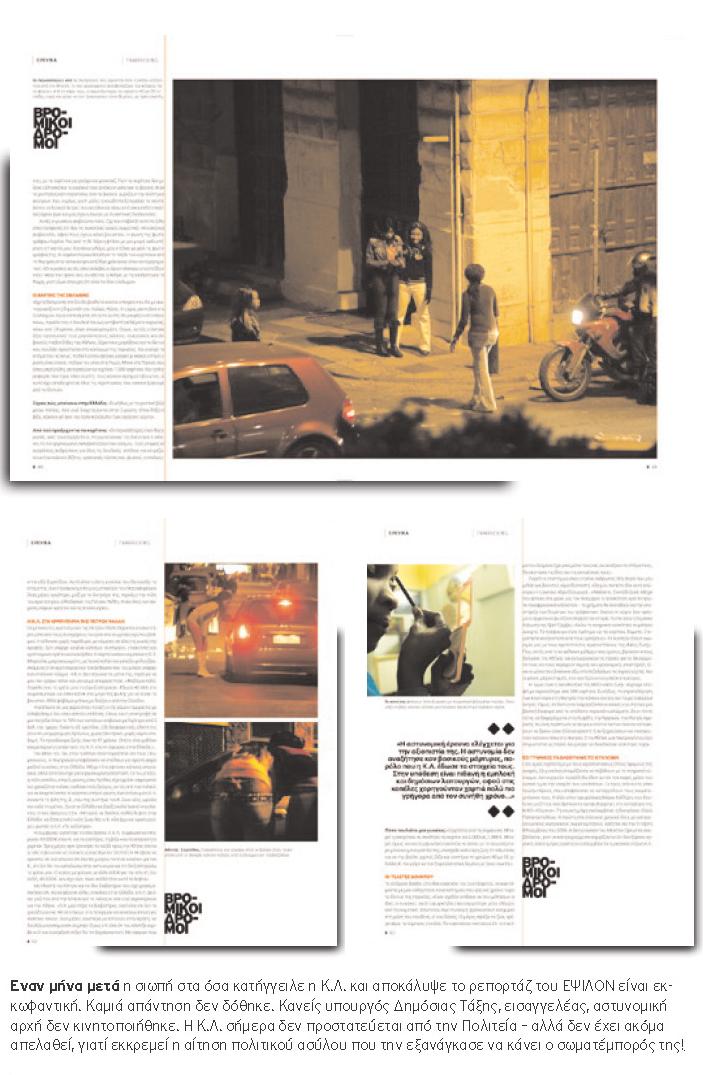 Τόσο δύσκολο το αυτονόητο δηλαδή. Εντωμεταξύ, οι αρχές του τόπου σωπαίνουν. Τι κι αν ο Αλέξης Τσίπρας –ο επικεφαλής της παράταξης Ανοιχτή Πόλη- έφερε άμεσα το θέμα στο δημοτικό συμβούλιο της Αθήνας; Τι κι αν ο Μιλτιάδης Βαρβιτσιώτης υπέβαλε, αμέσως μετά το δημοσίευμά μας, ερώτηση στον υπουργό δημοσίας τάξης; Ακόμα ο δήμαρχος Αθηναίων δεν έχει πει δημόσια μια λέξη για τα κορίτσια που εκδίδονται στα στενά πίσω ακριβώς από το δημαρχείο του. Ακόμα ο υπουργός δεν έχει τοποθετηθεί για το τι προτίθεται να κάνει για να προστατεύσει την Κ.Λ. Ακόμα χειρότερα, η σιωπή των υπολοίπων είναι εκκωφαντική.