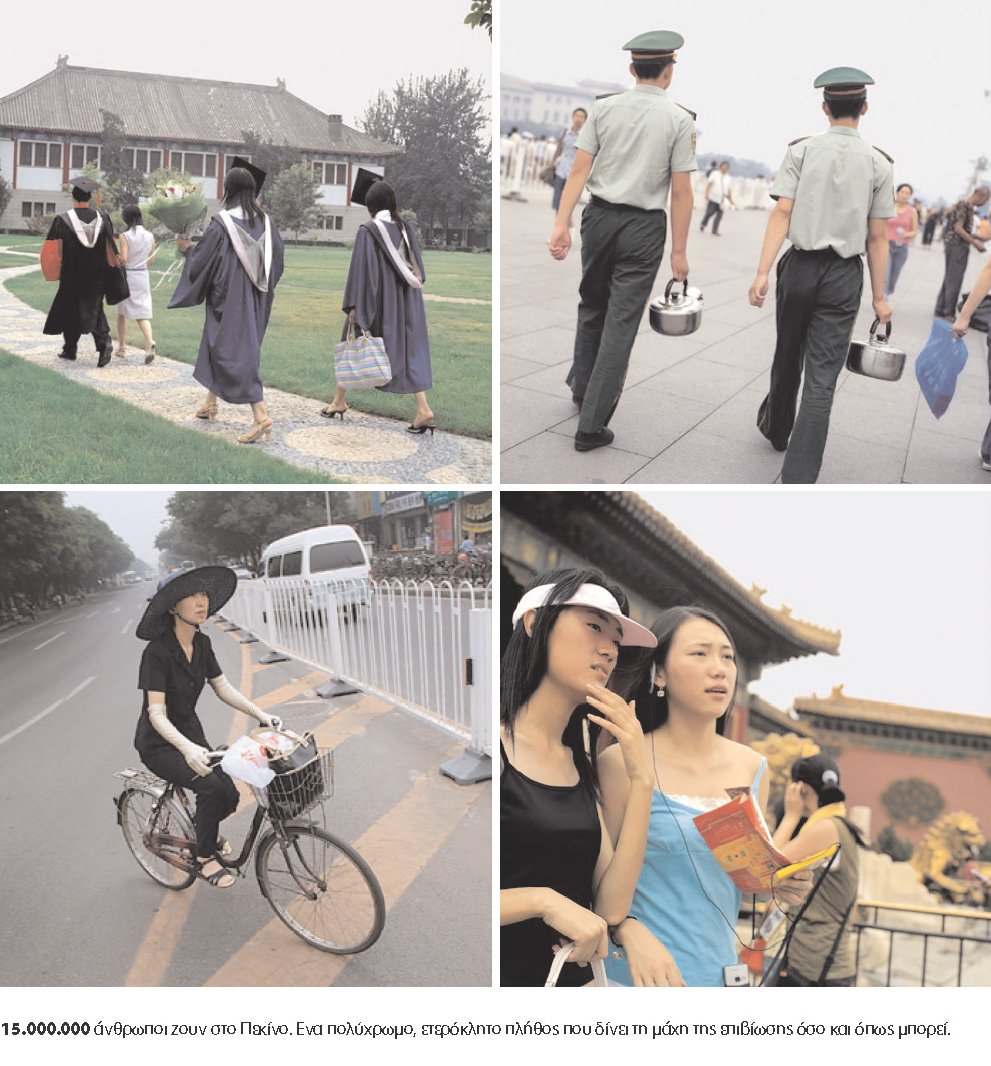 Περίεργα, κομμένος στα δυο, θα νιώσεις πολλές φορές στο Πεκίνο. Οταν θα απολαμβάνεις ποδηλατάδα με ένα φουτόν και την ίδια στιγμή θα φτύνεις τον εαυτό σου που βάζει έναν άνθρωπο να κάνει ορθοπεταλιές στο λιοπύρι. Οταν θα παζαρεύεις με τη μεταφράστριά σου αν θα πάρει 20Ε για 12 ή για 15 ώρες. Οταν θα μπαίνεις στο χλιδάτο σου ξενοδοχείο κι ακριβώς απέξω άνθρωποι θα κοιμούνται στα παγκάκια. Εδώ όμως δεν είναι Δύση. Εδώ σε κοιτάζει ολούθε ο πρόεδρος Μάο, ανεμίζουν οι κόκκινες παντιέρες. Κι εσύ δεν καταλαβαίνεις. Να τον πεις κόκκινο καπιταλισμό; Να τον πεις αγοραίο κομμουνισμό; Να το πεις οικονομικό θαύμα; Δεν λές τίποτα και κοιτάζεις γύρω σου χαμένος.