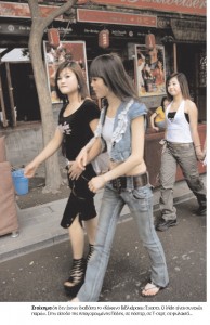 Είναι τρεις. Φιλικές, γελαστές κι αφάνταστα χαριτωμένες κάτω από τα ομπρελίνα τους. Γνωριζόμαστε σε μια διάβαση πεζών. Είναι φοιτήτριες. “Θέλετε να σας πάμε μια βόλτα;”, ρωτάνε με τα σπαστά, ασιάτικα αγγλικά τους. Και μας γυρίζουν στην παλιά αγορά. Δεν είναι απλώς αγορά, είναι μετάβαση σε άλλη πραγματικότητα. Τα φαρμακεία μυρίζουν τζίνσενγκ και μανδραγόρα, ενώ φίδια και σαύρες σε χαζεύουν μέσα από τη φορμόλη. Μικρά μαγαζάκια με πλυντήρια, κιόσκια με σουβλάκια από σκύλο και σκορπιούς, κοριτσάκια που προτείνουν μασάζ, τσιγάρα με γεύση πεπόνι. Ολα πολύχρωμα κι όλα θα ήταν μαγικά αν δεν άκουγες συνέχεια τα μεγάφωνα να τσιρίζουν. Οι κινέζοι λατρεύουν τα μεγάφωνα. Ακόμα και οι κομμώτριες, με τον πάγκο με τις βούρτσες και τις χτένες καταμεσής του δρόμου, φορούν το ασύρματο μικρόφωνό τους στο αυτί και διαλαλούν μέσα από το μεγάφωνό τους «εδώ το καλό σινιόν». Ακόμα και οι μπάτσοι (που περπατούν δυο – δυο, τρεις – τρεις σε παράταξη με τα άσπρα γάντια τους) σου μιλάνε με τον τηλεβόα έστω κι αν απέχεις μόνο ένα μέτρο.