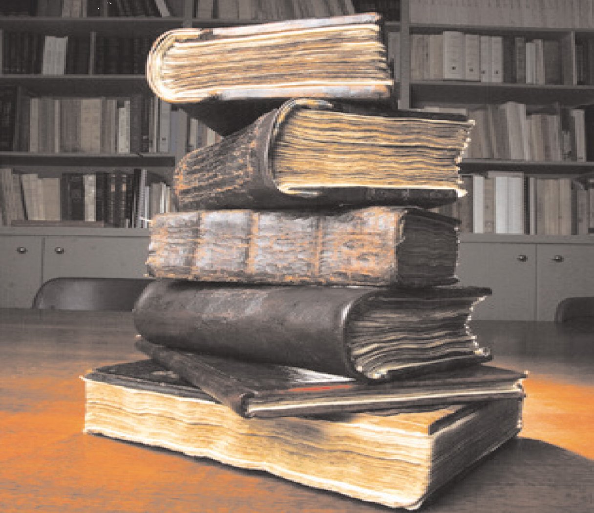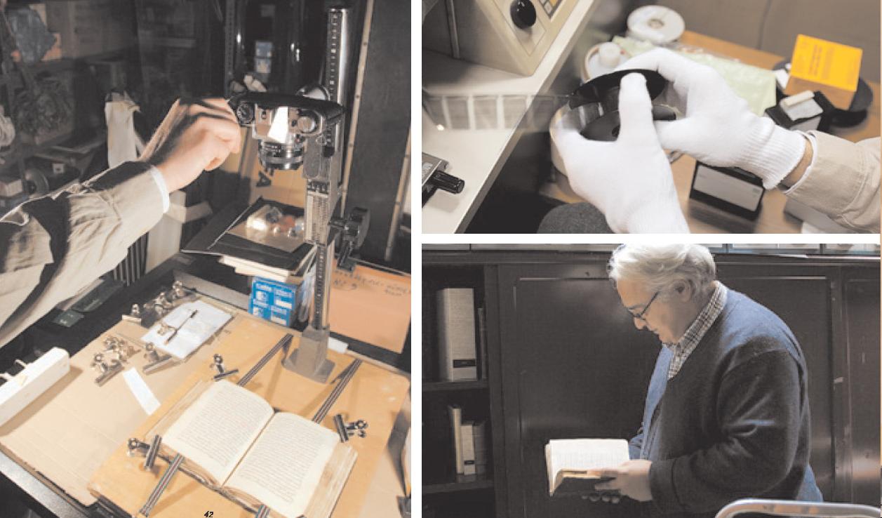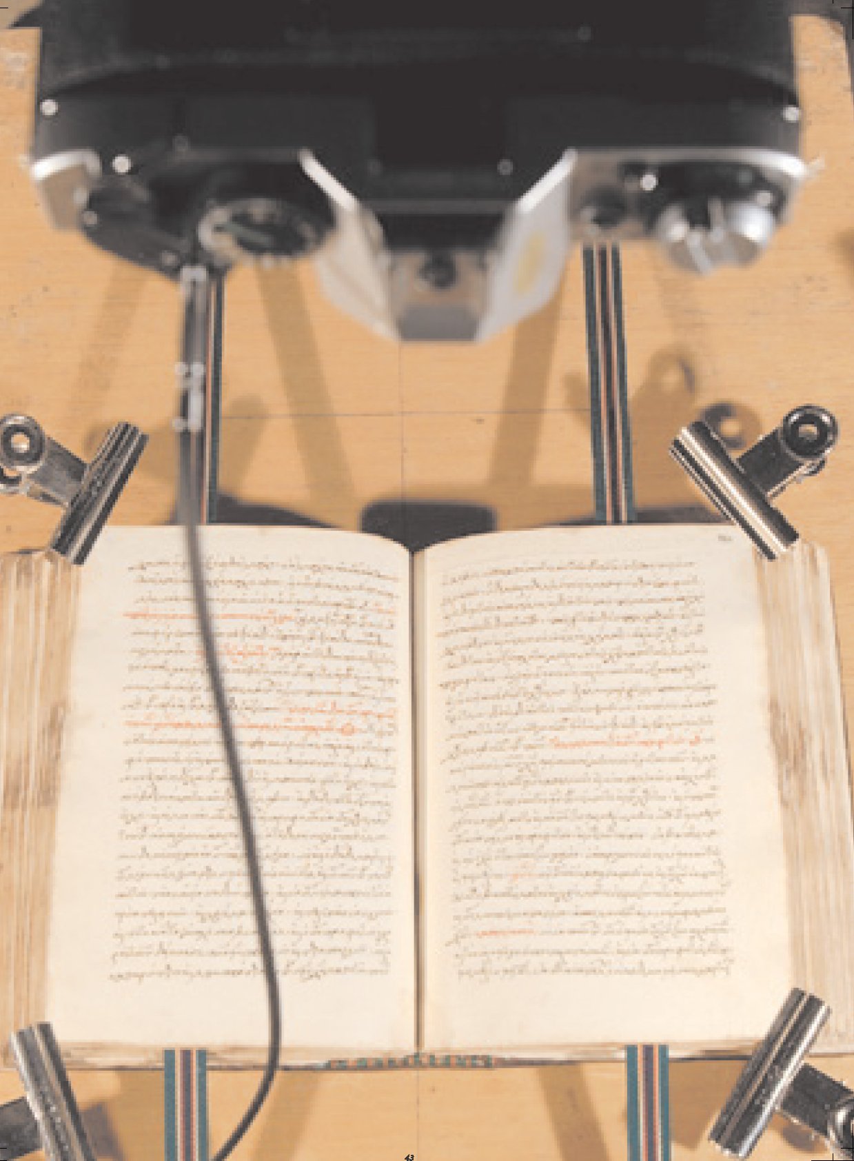 Είναι μικρό όσο η χούφτα μου. Ξύλινο εξώφυλλο και σελίδες από ένα χαρτί παράξενο, κιτρινισμένο από το χρόνο, αλλά στιβαρό. Δεν μπορώ να το διαβάσω, αν και αναγνωρίζω κάποια από τα γράμματα. Στο μικρό αυτό δωματιάκι, στον πρώτο όροφο ενός κτιρίου της Παναγή Σκουζέ, μέσα σε ράφια και συρτάρια και σε συνθήκες ψύξης, αναπαύονται βιβλία από όλη την Ελλάδα, την Αλεξάνδρεια, την Κωνσταντινούπολη, τα Ιεροσόλυμα, το Σινά. Ταξίδεψαν και άντεξαν στο χρόνο μέχρι να τα συλλέξουν, να τα συντηρήσουν και να τα διαβάσουν οι παλαιογράφοι του Μορφωτικού Ιδρύματος της Εθνικής Τραπέζης.