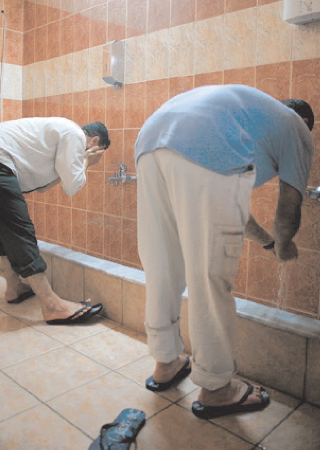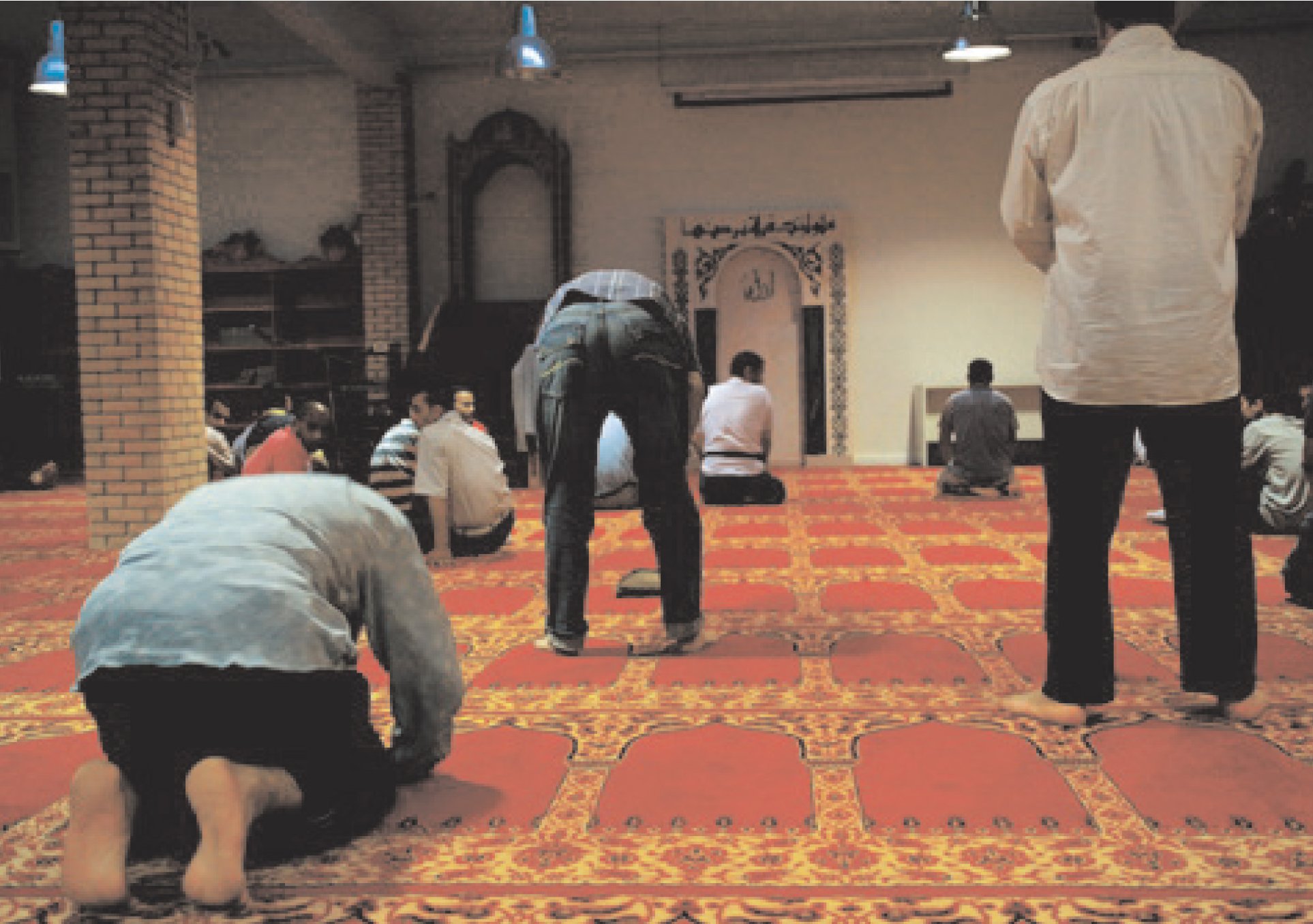 Η ώρα είναι 2.30 και περίπου 300 πιστοί διαβάζουν ψιθυριστά το Κοράνι στην κλιματιζόμενη αίθουσα. Ο χώρος είναι γυμνός από εικόνες, γλυπτά ή στολίδια. Το μόνο που θυμίζει χώρο προσευχής είναι η υπερυψωμένη θέση του ιμάμη και η βιβλιοθήκη με τα ιερά βιβλία. Επικρατεί μια ησυχία σχεδόν κατανυκτική. Στραμμένοι όλοι προς τη Μέκκα, περιμένουμε τις πρώτες λέξεις: «Ο Αλλάχ είναι μεγάλος, ο Αλλάχ είναι πολυεύσπλαχνος».