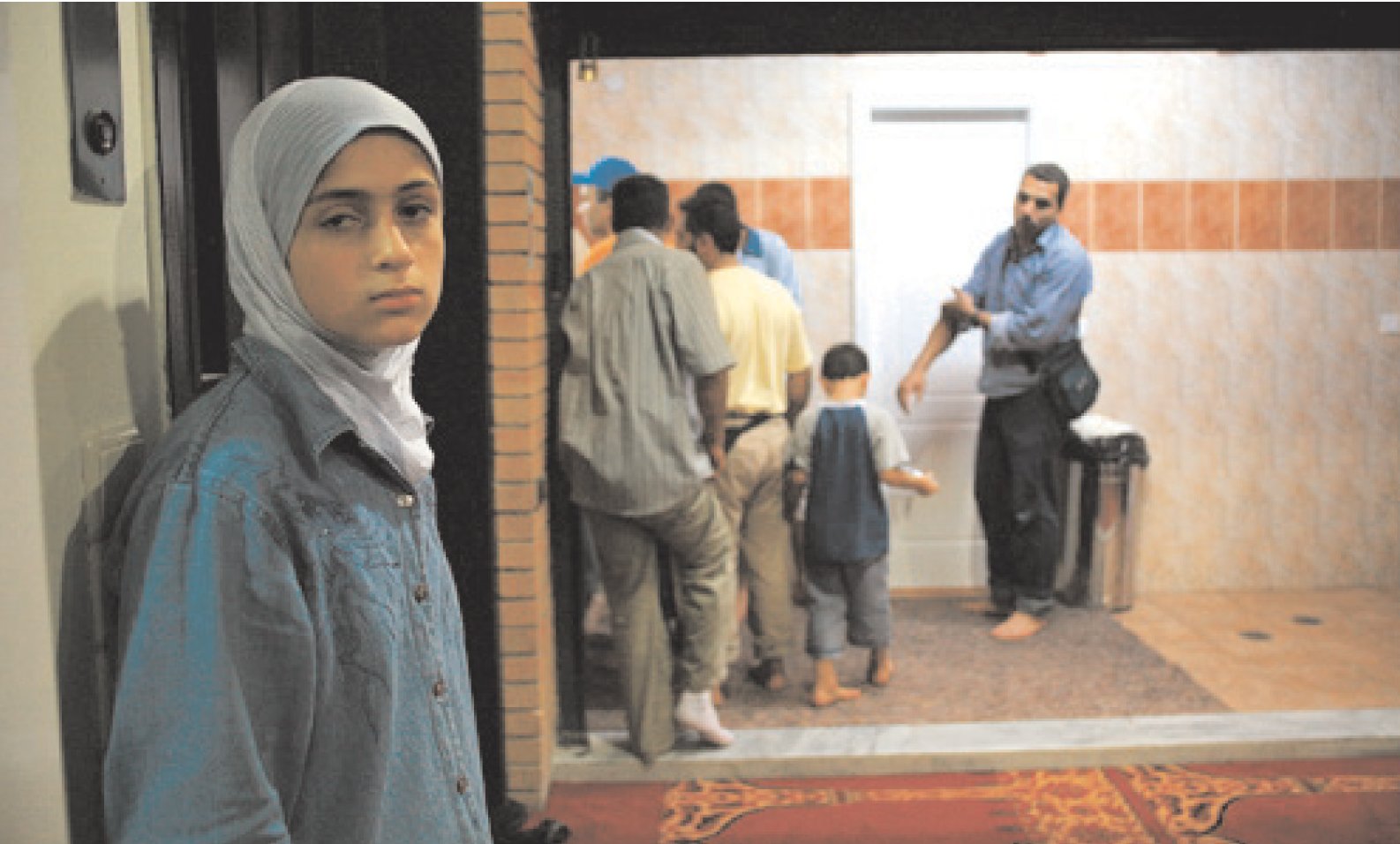 Το κτίριο στην Κύπρου και Πειραιώς δεν θυμίζει τζαμί. Θα μπορούσε να είναι «σύγχρονο κτίριο γραφείων», με τα διακοσμητικά τουβλάκια του και τα αμμοβολημένα του τζάμια. Μόνο από κοντά διακρίνεις τις επιγραφές του στα αραβικά. Κατά τις 2 το μεσημέρι εισέρχονται οι επισκέπτες: πρώτα πλένουν τα πόδια τους και μετά μπαίνουν από την κύρια είσοδο, βγάζουν τα παπούτσια τους, τα αφήνουν σε μια ντουλάπα και περπατούν ξυπόλητοι στο κόκκινο χαλί. Αν είναι αρσενικοί.