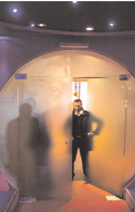 Η είσοδος προς την κεντρική αίθουσα. Ενας από τους κοστουμαρισμένους και άγρυπνους «σωματοφύλακες» βρίσκεται πάντα εδώ. Κοντά στο νου κι η γνώση: το αλκοόλ ρέει άφθονο, κάποιοι πελάτες... παραπίνουν.