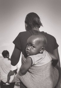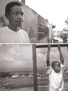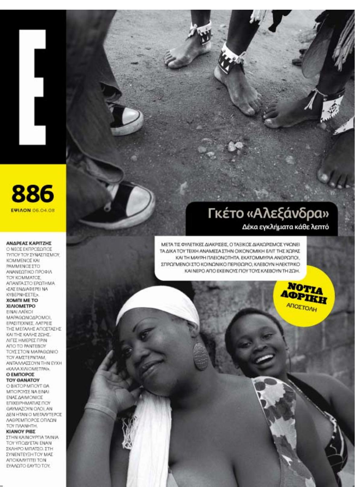 Και νά με εδώ, τώρα, φορώντας ένα παντελόνι δίχως τσέπες, χωρίς τσάντα, χωρίς κανένα κόσμημα, «χωρίς τίποτα που θα προκαλέσει κάποιον να σε κλέψει. Αρκεί που είσαι λευκή, θα κάνεις μπαμ έτσι κι αλλιώς». Αυτές ήταν οι οδηγίες του μπάτσου που με συνοδεύει ντυμένος με πολιτικά. Κάνω τα πρώτα μου βήματα στο γκέτο σαν σε τουριστική ατραξιόν. Οσο εγώ κοιτάω με γουρλωμένα μάτια γύρω μου, άλλο τόσο με χαζεύουν οι άνθρωποι. Αλλωστε, είμαστε κι εμείς μια παράξενη κουστωδία: ο σύνδεσμός μας, ο Κωστάκης, μιλάει ελληνικά, αγγλικά και ζουλού και οδηγεί το αμάξι με 5 χιλιόμετρα την ώρα. Ο Ντούμι, ο αστυνομικός, που περπατάει δίπλα μου με το σιδερικό. Κι ο Γιόνεκ – πιο πολύ από όλους ο Γιόνεκ. Που κουβαλάει επάνω του εξοπλισμό που θα μπορούσε να ζήσει μια οικογένεια για 3 χρόνια. Και που πρέπει να εξηγεί στα πιτσιρίκια ότι αυτό που κρατάει στα χέρια του είναι κάμερα και όχι όπλο. Γιατί έτσι είναι η πραγματικότητα εδώ: τα παιδιά είναι εξοικειωμένα με τα όπλα και δεν έχουν ξαναδεί φωτογραφική μηχανή.