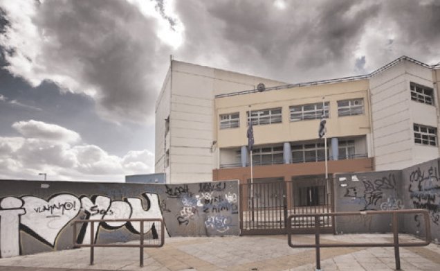 Το σχολείο (δεξιά) είναι το μοναδικό δημόσιο κτήριο. Κι όμως, οι μαθητές του το «πληγώνουν» διαρκώς: ξηλώνουν, σπάνε, μουντζουρώνουν. Γιατί; «Από ανία» λέει ο γυμνασιάρχης τους Γ. Μαντζαρίδης. «Αντε κι εσύ να επιβιώσεις σε μια πόλη που δεν έχει κανένα σημείο συνάντησης με τους άλλους ανθρώπους».