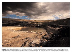 Οδηγούμε προς το ορυχείο του Νοτίου Πεδίου, το μεγαλύτερο από τα 4 που λειτουργούν στο Λιγνιτικό Κέντρο Πτολεμαϊδας – Αμυνταίου, που παράγει περίπου 50 εκατομμύρια τόνους λιγνίτη το χρόνο. «Τα ορυχεία άλλαξαν τελείως τη μορφή της περιοχής μας. Παλιά τα χωράφια ήταν εύφορα και υπήρχαν πολλά είδη ζώων. Αλλά τώρα όλα έχουν αλλάξει. Τα δέντρα κόπηκαν και πολλά χωράφια δόθηκαν στη ΔΕΗ. Τα ζώα έφυγαν». Αυτό που διαβάζω είναι η έκθεση ενός μικρού μαθητή.