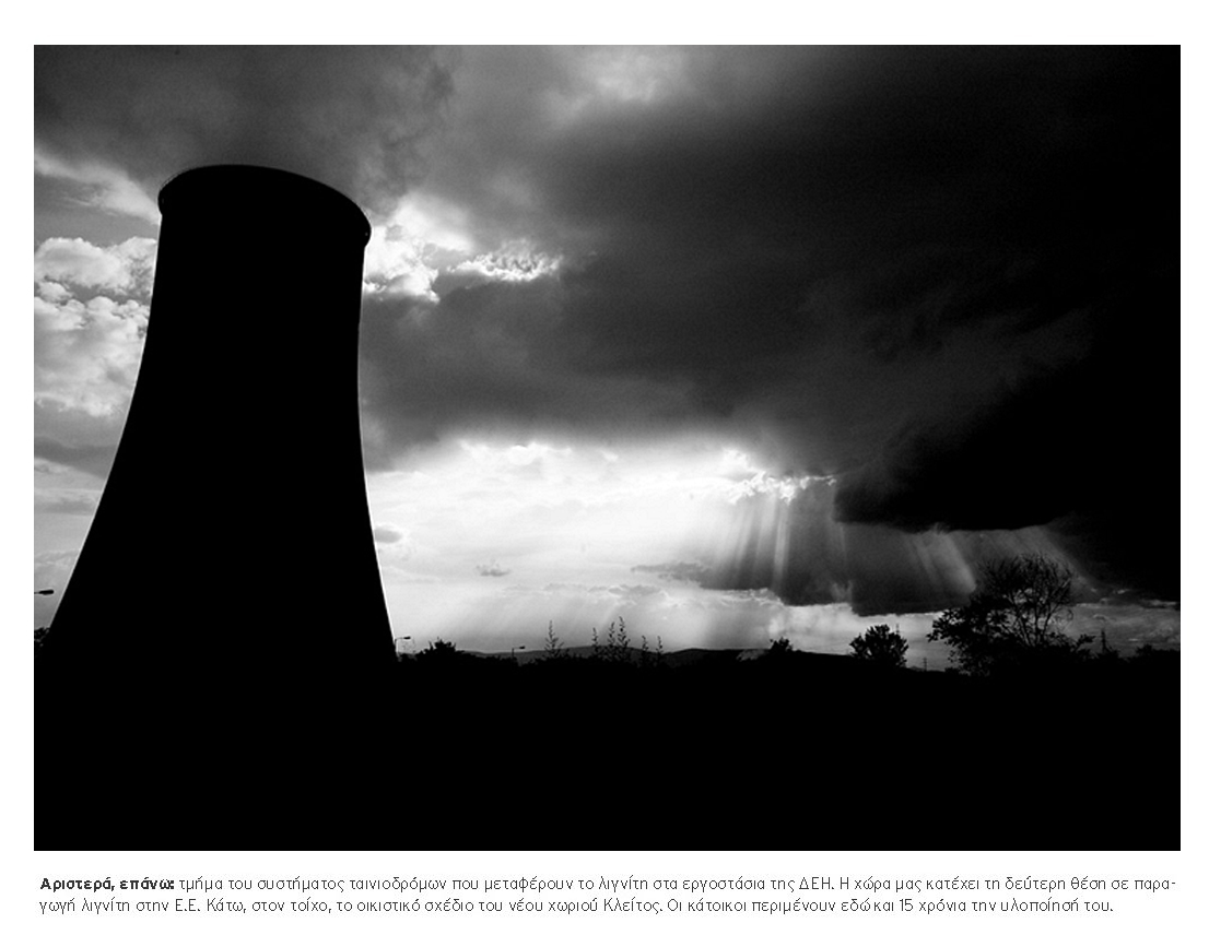 Το ορυχείο πλησιάζει ολοένα και πιο απειλητικά τα χωριά της κοιλάδας της Εορδαίας. Ήδη κατάπιε τη Χαραυγή, που τώρα στέκει ερειπωμένη, με μοναδικούς κατοίκους μέσα στα χαλάσματα περαστικούς φορτηγατζήδες κι άστεγους μετανάστες. Τώρα σιγά σιγά ερημώνει και το διπλανό χωριό, ο Κλείτος. Η ΔΕΗ απαλλοτριώνει αναγκαστικά τα χωράφια και τα σπίτια των κατοίκων του οι οποίοι, με μια ελάχιστη αποζημίωση στα χέρια, πρέπει να βρουν έναν νέο τόπο για να χτίσουν καινούργιο χωριό. Μέσα στο υπό κατάρρευση καφενείο του Κλείτου, καμιά 10αριά γερόντια παίζουν χαρτιά. Δίπλα μου κάθεται ο κυρ Θανάσης, ετών 70. Δίπλα του, στον τοίχο, το οικιστικό σχέδιο του νέου χωριού που εδώ και 15 χρόνια τους υπόσχεται το κράτος πως θα ολοκληρωθεί κι ακόμα να ετοιμαστεί. «Πρόσφυγες ήρθαν οι παππούδες μας γιατί τους έκοψε το μαχαίρι του Τούρκου, πρόσφυγες γινόμαστε κι εμείς. Τουλάχιστον εμείς θα φύγομε. Τους άλλους στον Άγιο Δημήτριο θα τους αφήσουν να σκάσουν σαν τα ποντίκια, γιατί κάτω από το χωριό τους δεν υπάρχει λιγνίτης».